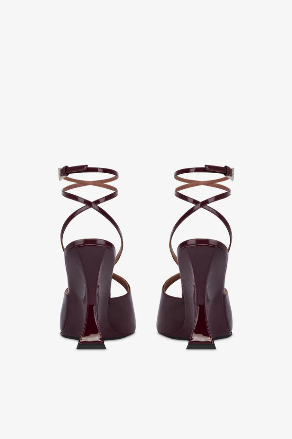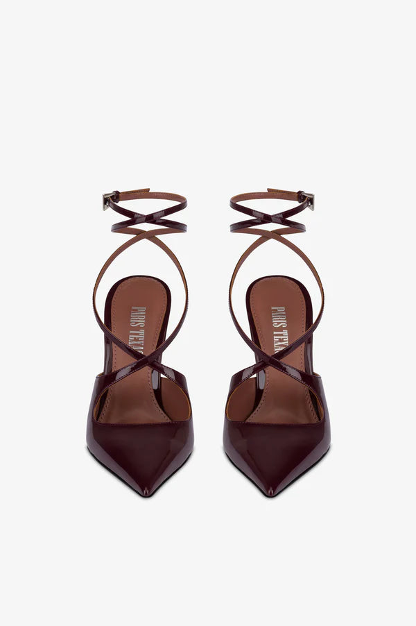 Pointed-toe pumps in rouge noir patent leather with an ankle strap. Covered wedge heel.