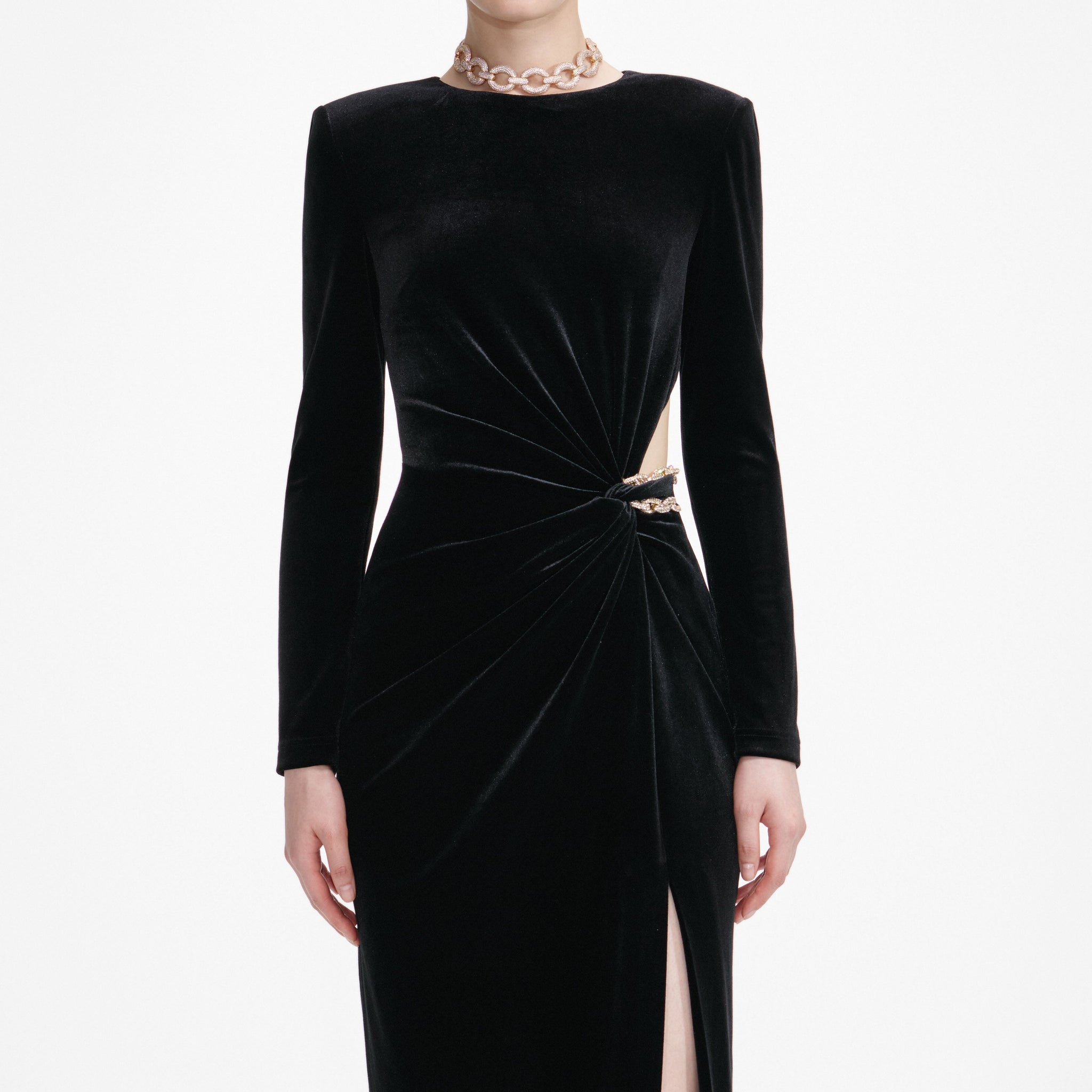 A bold side cut-out dials up the drama on this black velvet midi dress. Accented with diamanté embellished gold chains for contemporary shine – style with heels to channel your inner femme fatale.