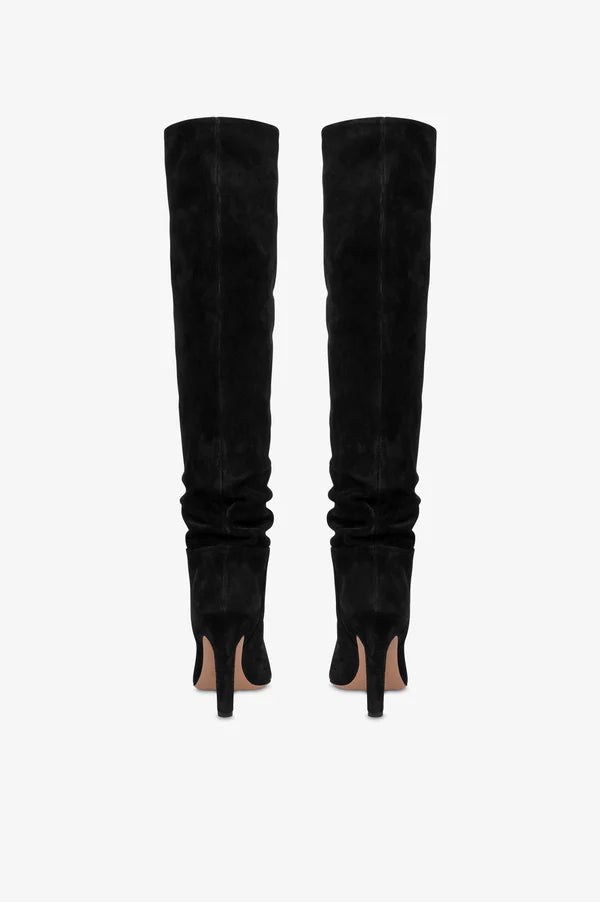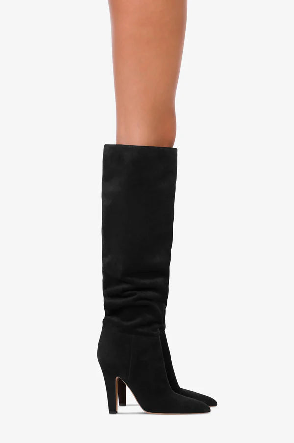 Round-toe boots in black calf suede leather. Covered cone heel. Made in Italy.