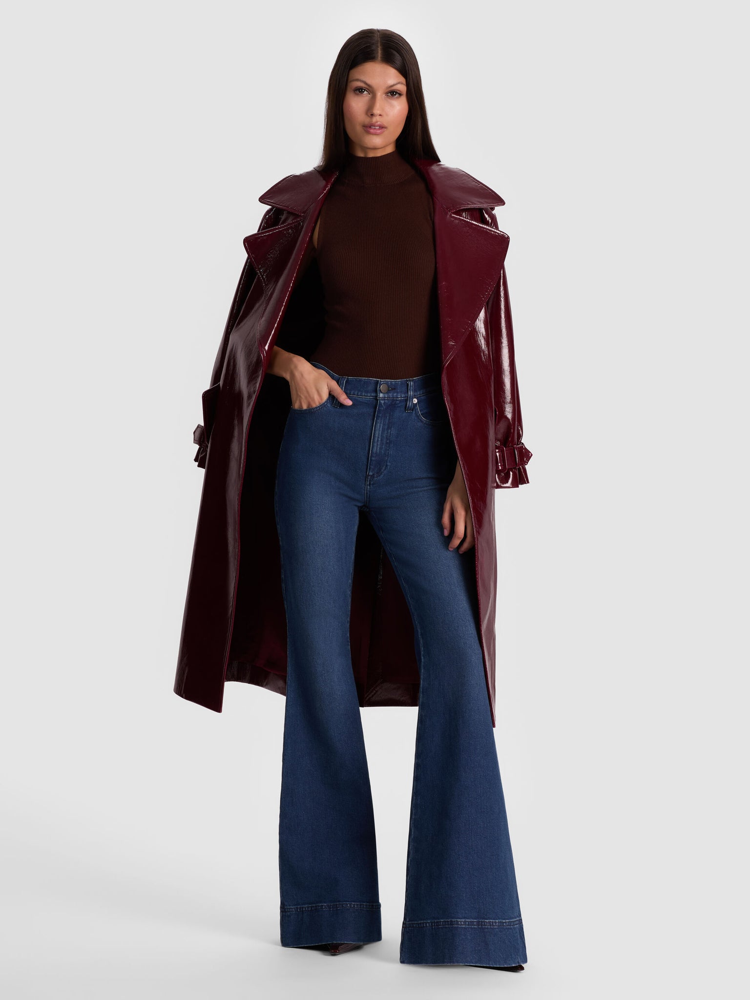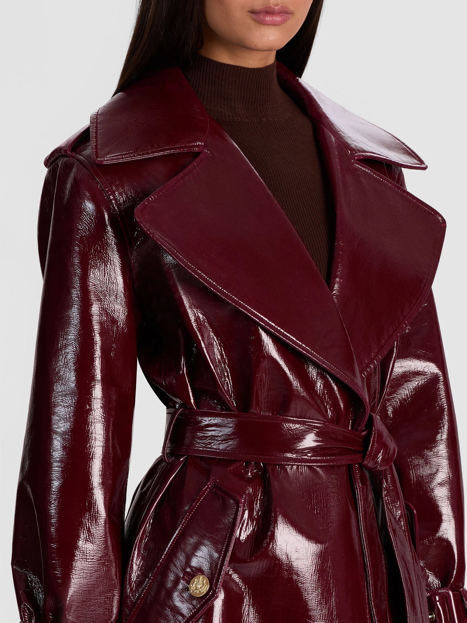 A timeless trench, reimagined in chic oxblood. The trench coat is an ultra-chic outer layer that combines the structure of a classic trench with the softness and depth of buttery faux leather. Cut in a midi length with a vented back and finished with an adjustable belt tie, it flatters the waist and moves effortlessly with you. Statement lapels, belted cuffs, and deep pockets give it that vintage-meets-modern edge. Fully lined and warm without feeling bulky, it’s the kind of piece that instantly elevates your entire outfit.